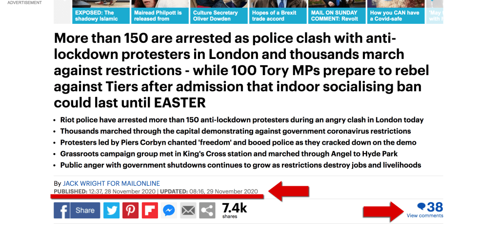 The divisive and more often Government lead Daily Mail refused comments on their top story covering the protests before allowing them a day later due to reader outcries on social media. The story originally published on the 28th November midday was swiftly edited to allow comment the following day after readers bombarded other comments sections with complaints and took to social media to protest what appeared to be silencing of supporting voices.